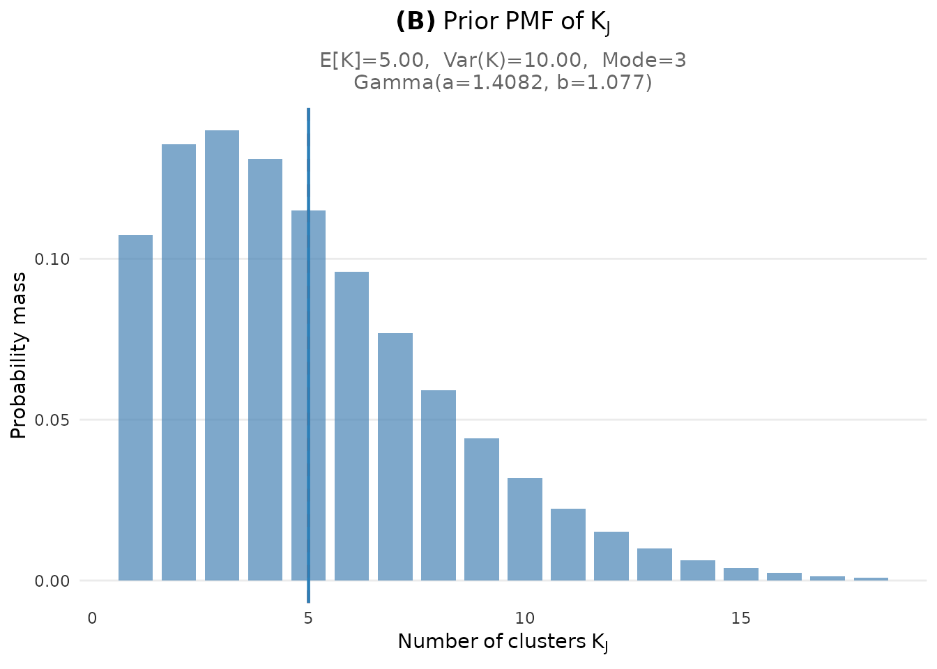 - Panel (B): The implied marginal PMF of the number of clusters , showing E[K], Var(K), and mode