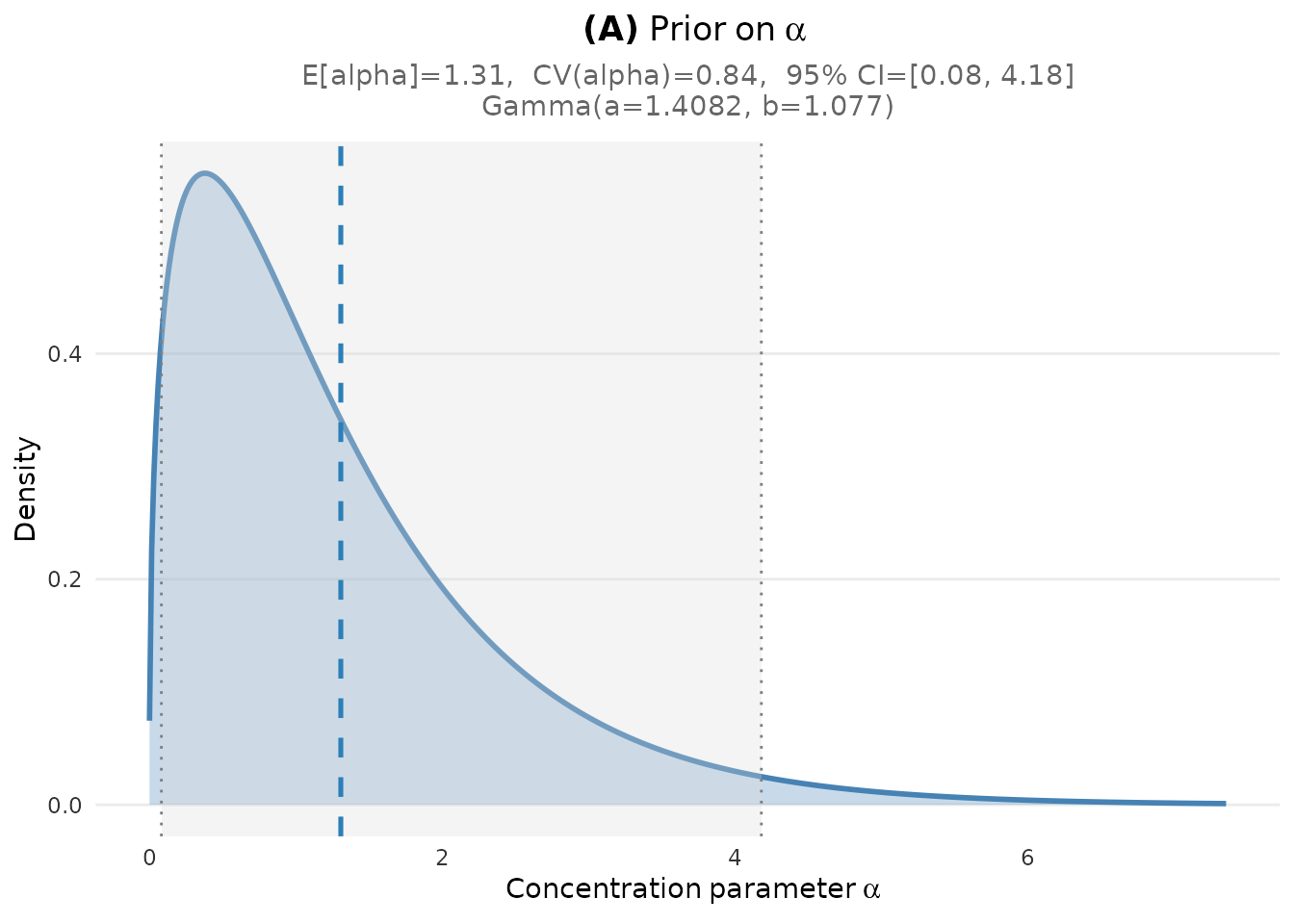 - Panel (A): The Gamma prior density for the concentration parameter , with key statistics (mean, CV, 95% CI)