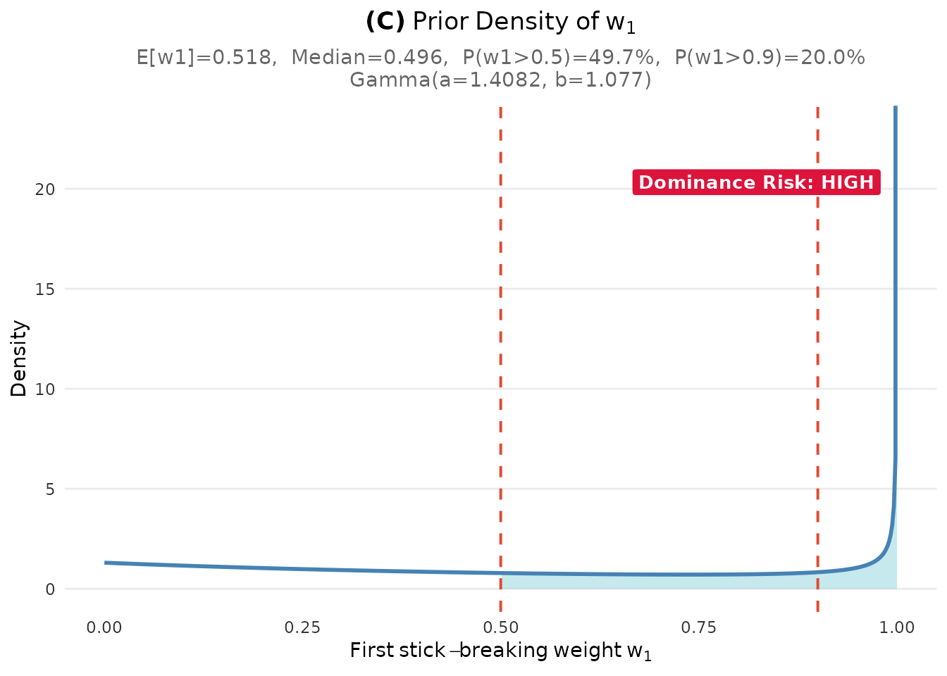 - Panel (C): The prior density of the first stick-breaking weight , with dominance risk assessment (useful for detecting overly concentrated priors)